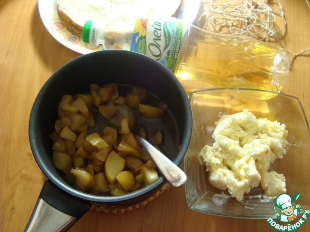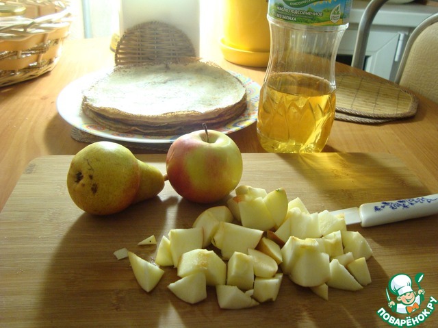 Яблоки и грушу режем небольшими кусочками и отправляем в сотейник.