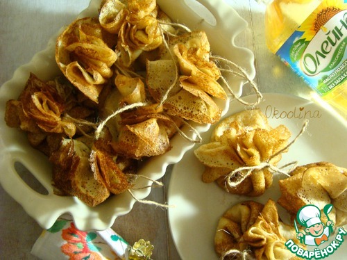 Сформировала мешочки. Блинчики тонкие и края получились очень красивые. Завязала мешочки шпагатом.
