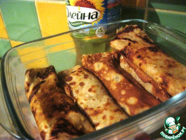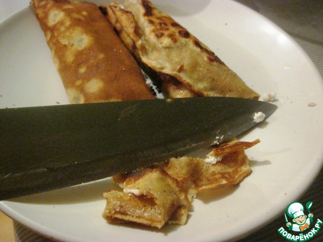 Накладываем сырную начинку на блины, заворачиваем их в трубочки
