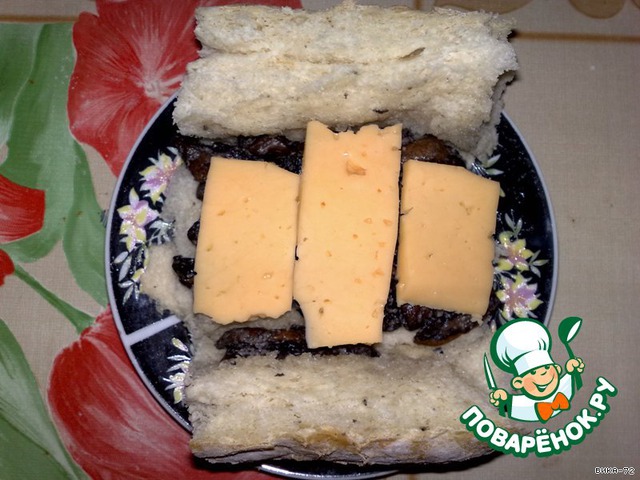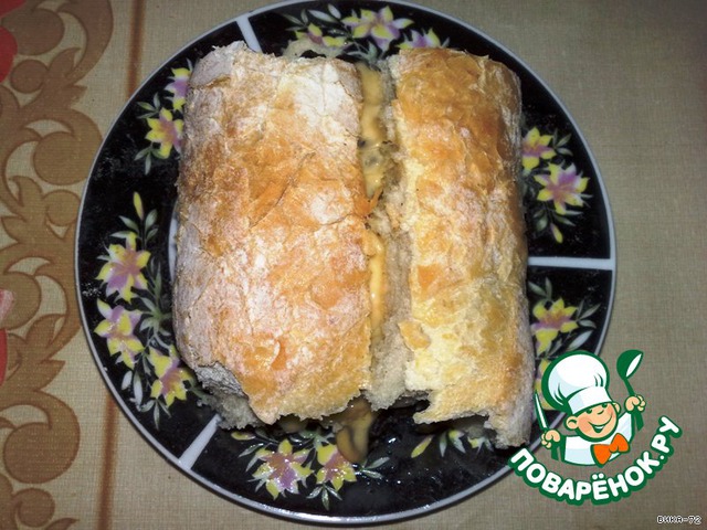 кусочек багета(примерно 10см) надрезала сверху вдоль и развернула.