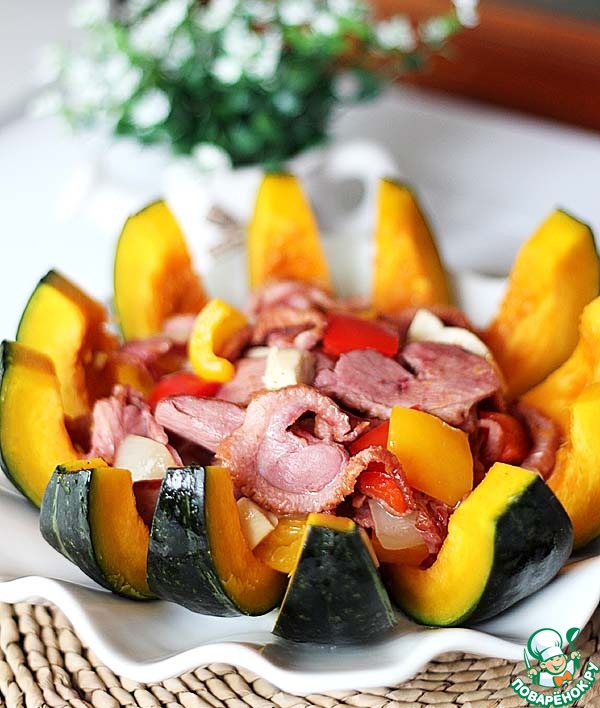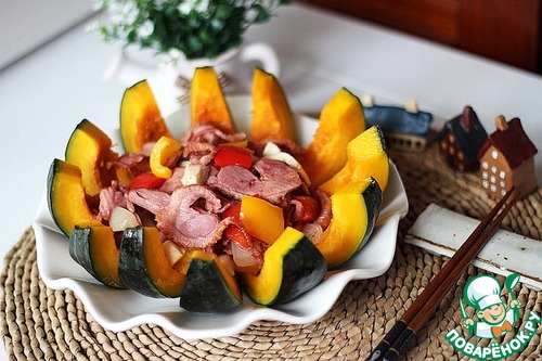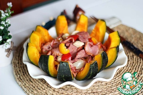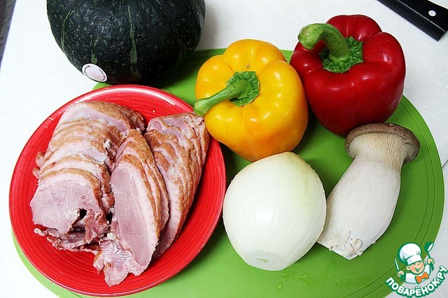 Для приготовления блюда нам потребуется небольшая тыква, копченая грудинка нарезанная, грибы, болгарский перец, репчатый лук.
