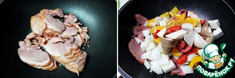 Разогрейте сковороду и обжарьте грудинку в течение минуты.