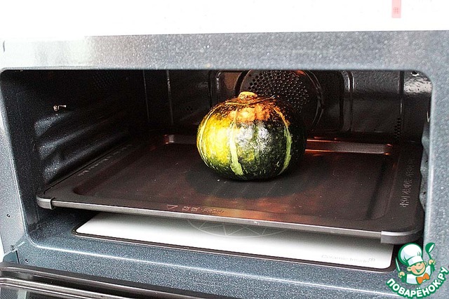 Закройте тыкву верхушкой и запекайте в духовке при температуре 190°C в течение 20 минут.
