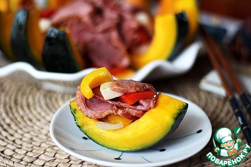 | Предлагаю вашему вниманию рецепт вкусной, ароматной и красивой закуски из тыквы. Она идеально украсит праздничный стол. Закуску удобно подавать гостям, тыквенные дольки легко брать руками, вилочкой и палочками. В качестве грибов я использовала королевскую вешенку, но вы также можете взять любые другие грибы, в том числе шампиньоны. В зависимости от количества гостей вы можете приготовить сразу несколько тыкв. |
