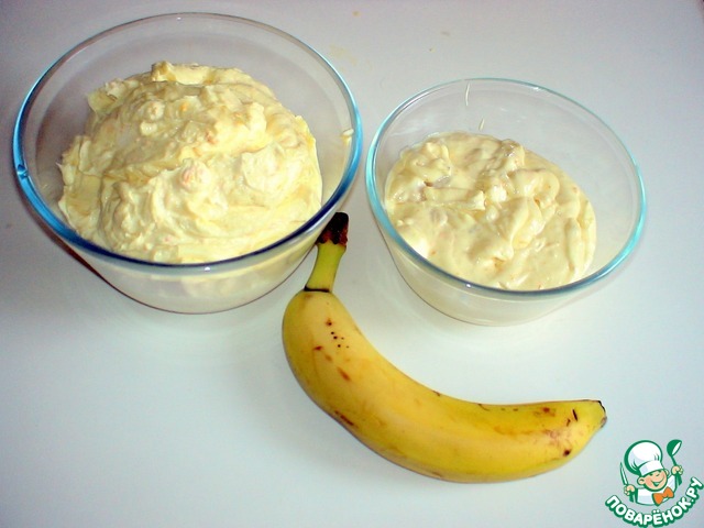 Отложить 5-6 ложек крема, добавить к нему банан, можете порезать его на мелкие кусочки, я пробила блендером.
