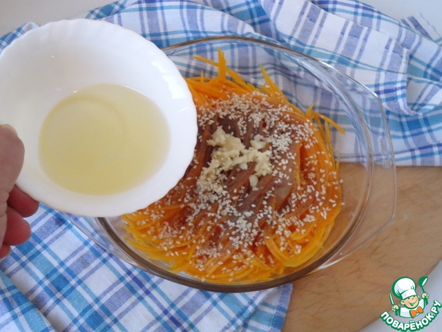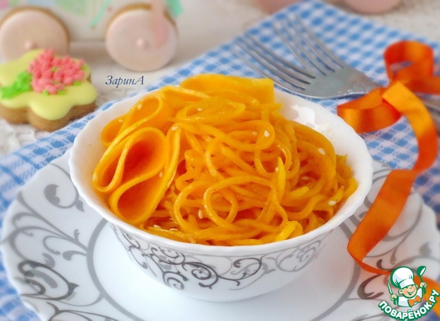 | Овощи, очень хороши в качестве закуски, по этому, легкий, пикантный салат будет востребован на праздничном столе. Обычно, подобный салат, готовлю из моркови еще со студенческих времен. Но, в этот раз решила попробовать тыкву, она у меня с дынным вкусом. А кунжут добавил ореховые нотки. Получился очень вкусный и ароматный салат. |