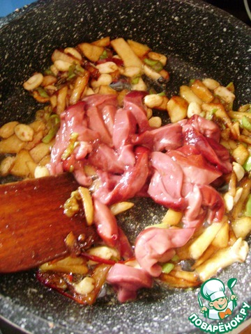 Промыть, обсушить и нарезать соломкой куриную печенку. Лук –порей нарезать кружочками, очищенное яблоко кубиками. Обжарить слегка на масле «Олейна» лук и яблоко до легкого румянца. Добавить арахис и соломку чили, слегка обжарить.