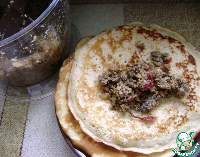 Выложить на середину блинчика по ложке начинки дорожкой.