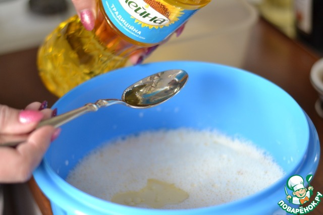 Добавить молоко, соль, подсолнечное масло "Олейна". Взбить.