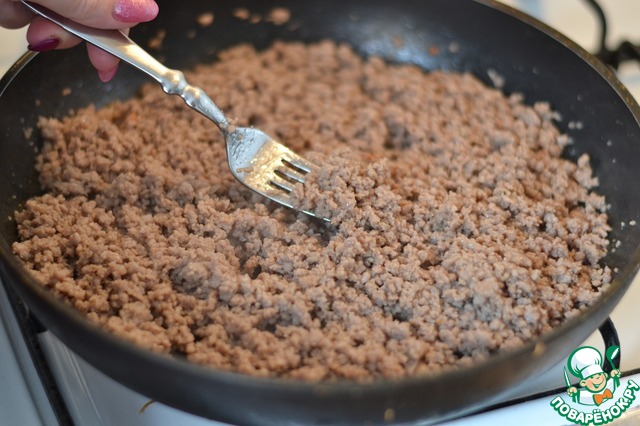 Мясной фарш, свинина плюс говядина, жарим на сухой сковороде.