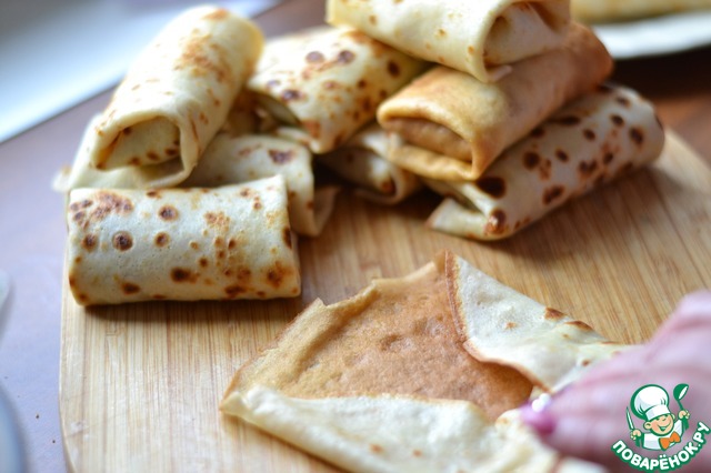 На каждый блин выкладываем начинку и заворачиваем в конвертик.