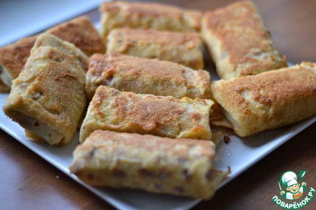 Обвалять блинные конвертики сначало в муке. потом в яйце и наконец
