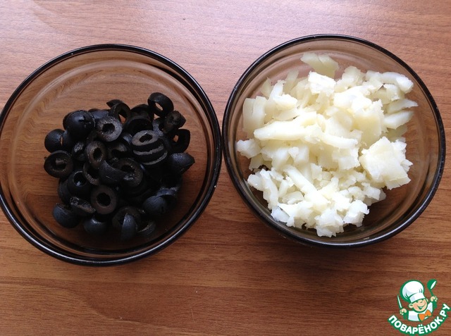 Маслины нарезать кружочками. Картофель очистить и нарезать средним кубиком