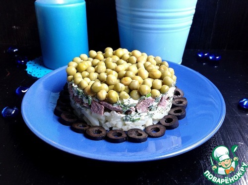 Говядину нарезать маленьким кубиком. Сделать соус: в чашке смешать майонез, мелко нарезанный укроп, и мелко нашинкованный репчатый лук, чеснок через пресс. Добавить соль и перец, перемешать. С горошка слить лишнюю жидкость