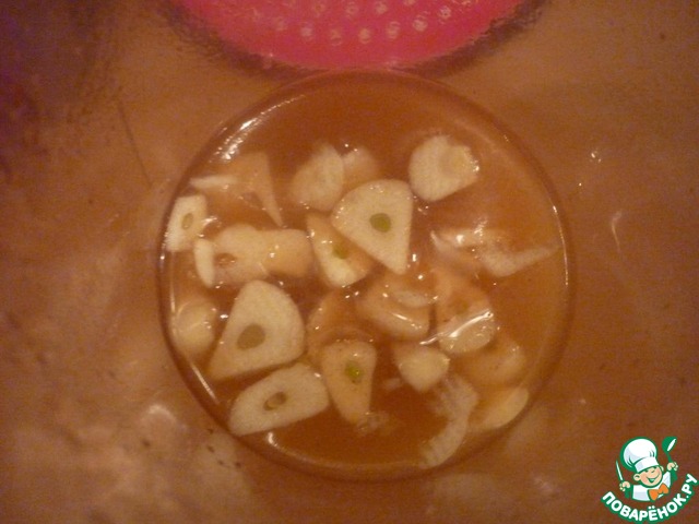 Туда же отправить приправу Малосянь, чеснок (нарезанный пластинами) и соль. Всё перемешать