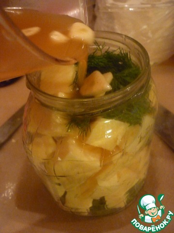 На дно банки уложить стебельки укропа, затем выложить сыр, сверху остаток укропа и залить маринадом.