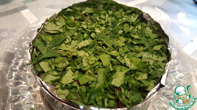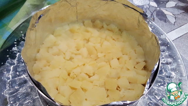 Итак, нарезаем мелко картофель, сало, красный лук. Кладём на тарелку кольцо, у меня 12 см, и собираем салат. На всякий случай я проложила кольцо фольгой. Первый слой картофель. Немного примять и слегка намазать майонезом.