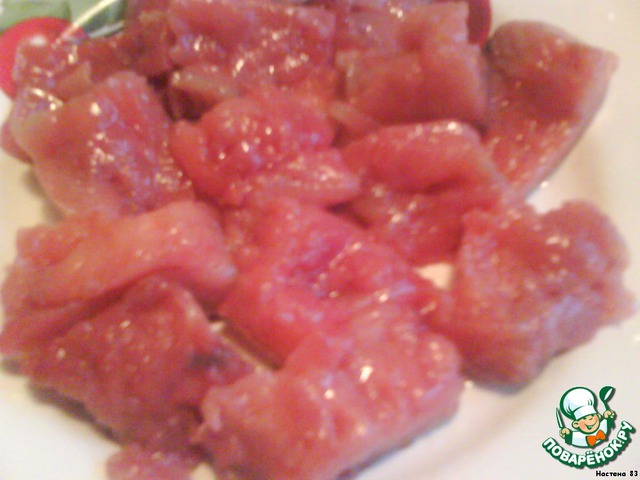 Филе соленой рыбы нарезаем квадратными пластинами