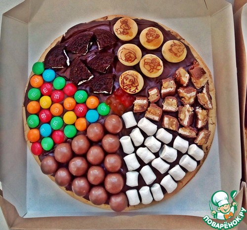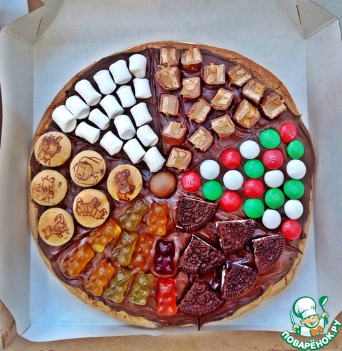 Эту пиццу я украсила зефиром, шоколадными шариками, M&Ms, печеньем Oreo (поделенным на четвертинки) и печеньем Choco Boy, порезанным на маленькие кусочки Snickers. В серединку положила двух мармеладных мишек.