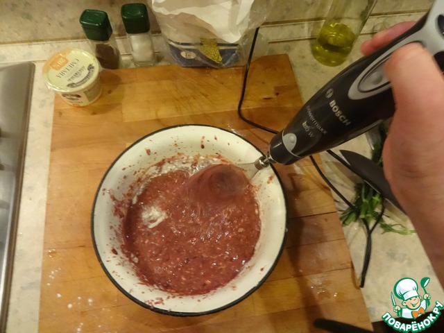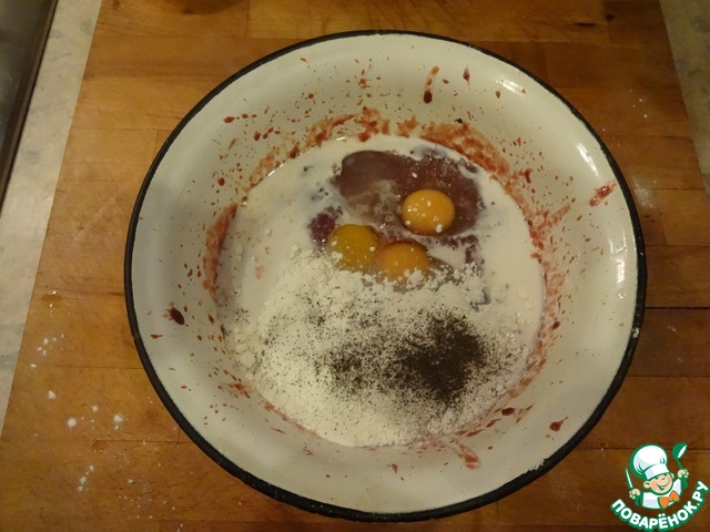 Добавляем гашеную соду, муку, яйца, молоко в наш фарш. Солим, перчим.