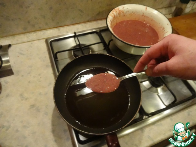 Разогреваем масло на сковороде и начинаем готовить на среднем огне. Я дозировал ложкой.