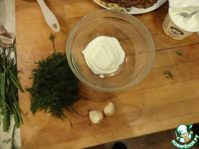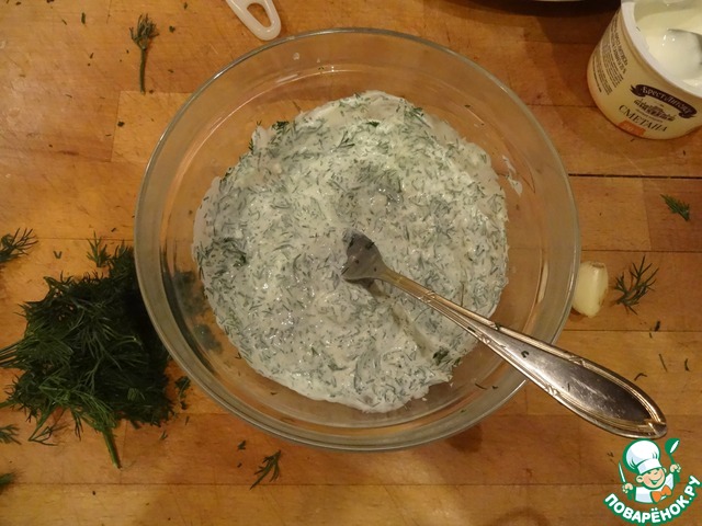 Количество чеснока и укропа в сметане - это дело вкуса каждого. Чеснок давим в сметану; укроп мелко рубим. Всё перемешиваем.