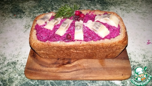 Конечно, я не буду учить Вас делать "селедку под шубой". Это и без меня умеют все. Отмечу только 1 момент - лук я мелко режу и заливаю кипятком, добавив в него по вкусу виноградный уксус, соль и сахар. Примерно через 30 мин. маринованный лук готов и можно приступать к сборке подарочного бутерброда.