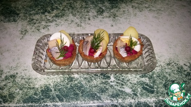 | Вариант подачи всеми любимого салата мне показался забавным. Приглашаю и Вас улыбнуться вместе со мной. Бонус - тарталетки из черного хлеба со свекольным муссом.. |