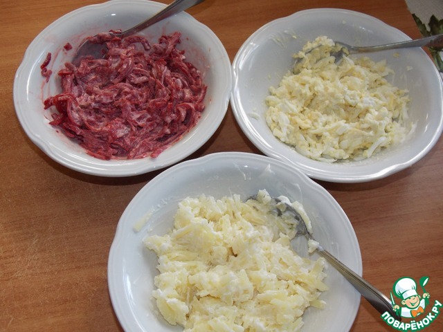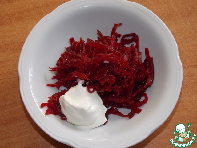 Свеклу натереть на тёрке, добавить майонез, немного посолить.
