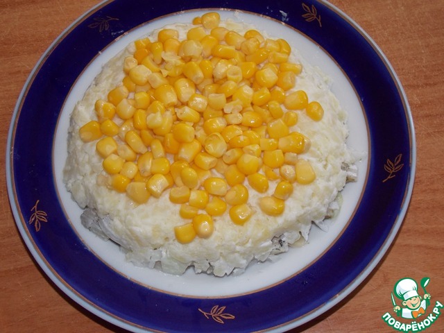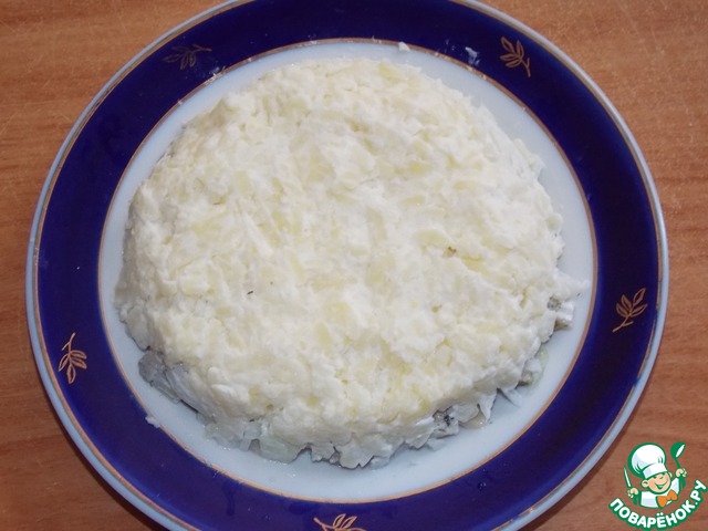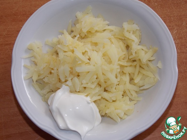 Картофель натереть на тёрке, добавить немного майонеза, немного посолить.