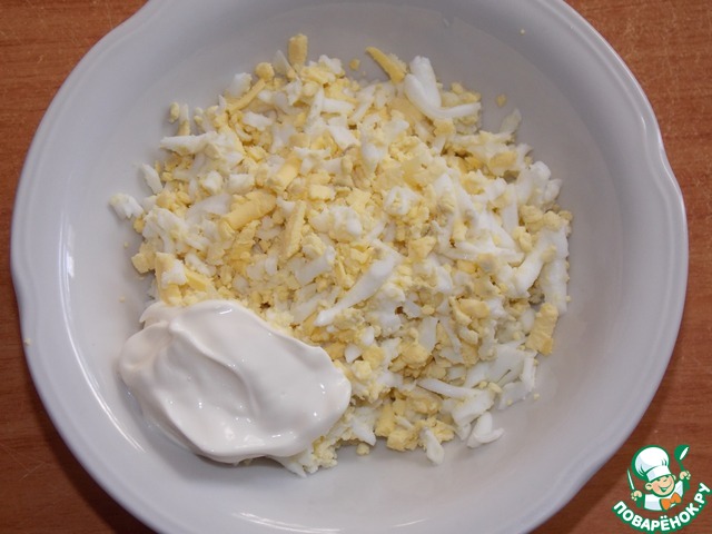 Яйца натереть на тёрке, добавить немного майонеза, посолить слегка.