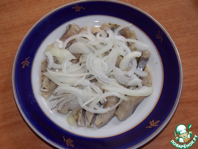 Лук нарезать, залить 50мл воды, добавить уксус. Оставить на 10 минут.
