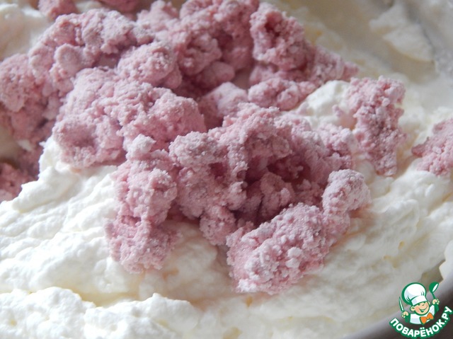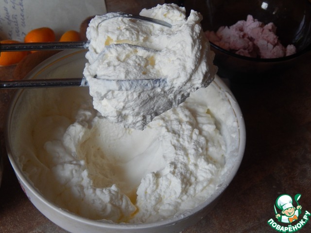 Взбиваем сливки до пиков, добавляя сахарную пудру