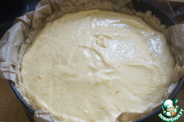Взять разъемную форму для выпечки, застелить бумагой для выпечки и выложить готовую крошку, формируем дно и бортики.