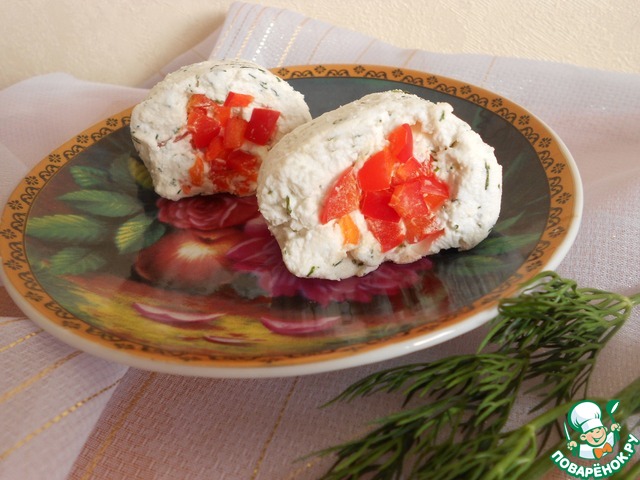 На пищевую пленку разложить творожную массу, посередине по долине выложить нарезанный сладкий перец. Свернуть в рулет. Завернуть в пищевую пленку и выложить в холодильник на пару часов.