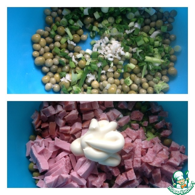Колбасные изделия нарезать маленьким кубиком, добавить майонез. Колбасно-копченые изделия можете брать на свой вкус. Вкусно будет и с колбасой п/к, и пробовала с карбонатом, но должно быть не менее 3 видов колбасных изделий.