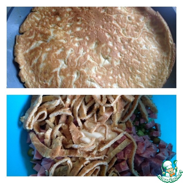 ... с двух сторон. Яичный блин получается пышным и хорошо переворачивается. Остывший блин нарезать соломкой и добавить к салату. Аккуратно перемешать салат. Сверху украсить сыром натертым на мелкой терке.