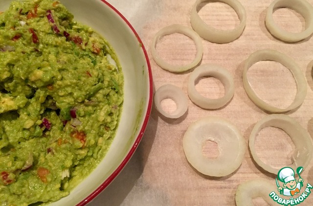 Вот такое гуакомоле получается. А дальше возьмите лук. Нарежьте колечками. Аккуратно разберите на " Колечки".