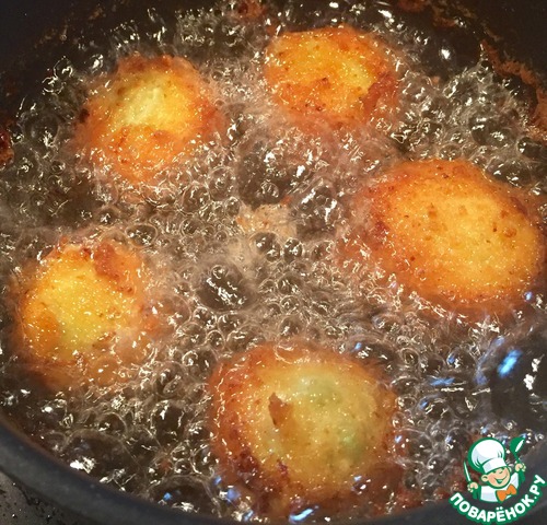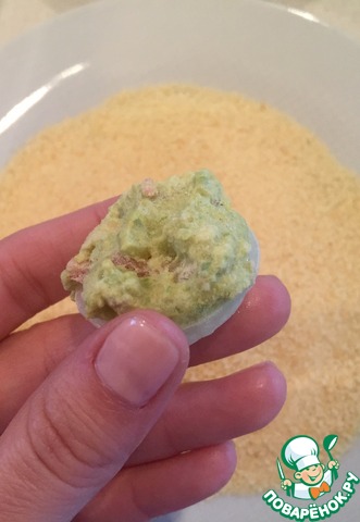 Теперь самый последний шаг. Возьмите муку, сухари и взбейте 2 яйца. Окуните каждое колечко в яйцо, муку, снова яйцо и следом в сухари. И опускайте в раскалённое масло. До подрумяниваемы.