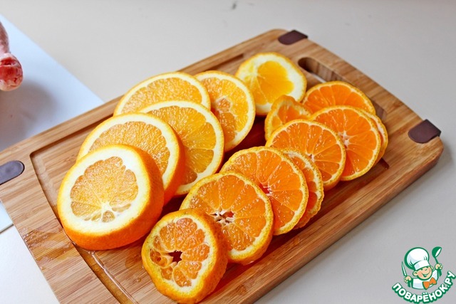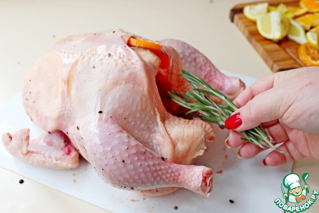 Просунуть кольца апельсинов под кожу курицы, как на грудке, так и на спинке.