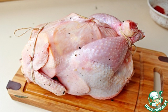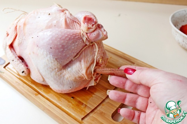 Ножки и крылья подвязать, скрепить место потрошения зубочистками.