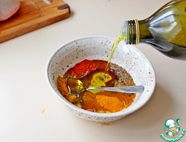 Из специй я использовала 1 ч л сладкой паприки,1/4 ч л молотого чили,1 ч л карри порошок,1/4 ч л куркумы.