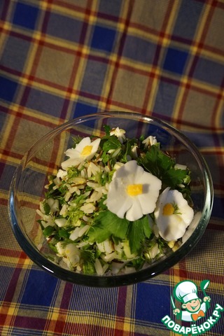 Зелень, кальмары, яйца - порезать. Перемешать с рисом. Заправить майонезом