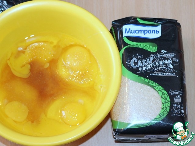 1. Взбиваем яйца с маленькой щепоткой соли миксером до бела. Затем понемногу добавляем сахар и взбиваем в течение 5 минут. Масса должна загустеть до мягких пиков и увеличиться в объёме в 2 раза.