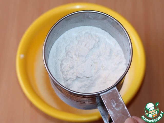 2. Смешиваем муку с разрыхлителем и ванилином, просеиваем. Вмешиваем ложкой муку в яичную смесь. Затем вымешиваем тесто миксером. Тесто должно получиться, как на оладьи.