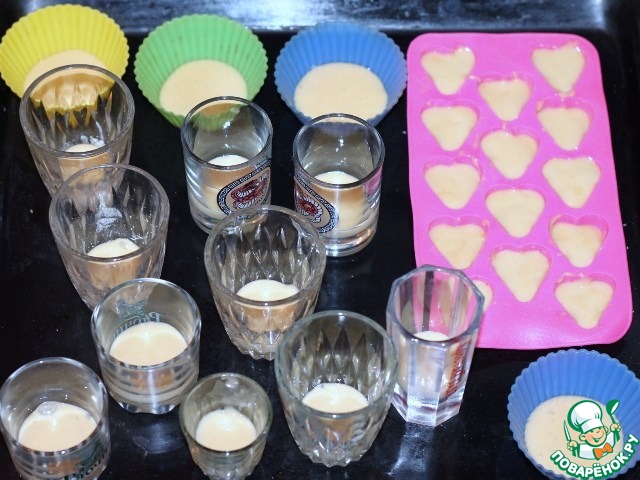 3. Для такой выпечки лучше взять маленькую формочку для кекса. Формочки НЕ смазываем маслом. У меня таких маленьких формочек не было и я приспособила маленькие рюмки с ТОЛСТЫМИ стенками. Вот когда пригодилась старая посуда. А лучше всего взять формочки под конфеты. Выкладываем тесто по 1 ч. ложке, без горок в формочки.