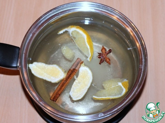 5. Приготовим ромовую Заливку. Смешиваем воду (1 л) с сахаром (350 г), добавляем лимонную цедру (0,5 лимона), палочку корицы (1 шт) и звёздочку аниса (1 шт). Сок лимона можно добавить по вкусу (0,5 лимона). Варим 10 минут. Процеживаем сироп.