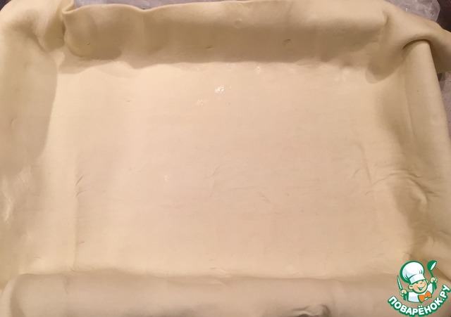 Смажьте растительным маслом. Выложите первый пласт теста.