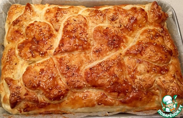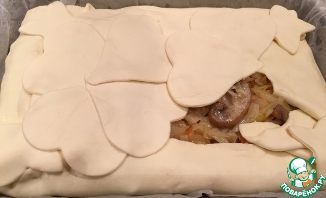 Заверните края. Поверх открытой капусты выложите вырезанные формой сердечки ( листики, кружочки...)