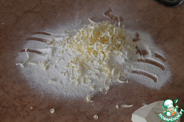 В муку натереть на крупной терке маргарин. Размять руками.